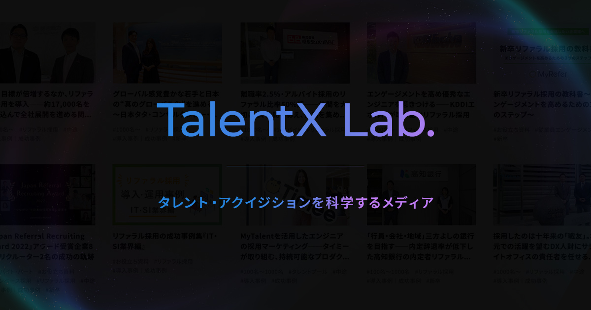 TalentX Lab. | AIネイティブ採用を実現する統合型タレントアクイジションプラットフォーム MyTalent Platf... タレントアクイジションを科学するメディア。自社の採用戦略を設計し、転職潜在層から応募獲得、魅力付け、入社後活躍につなげるためのタレントアクイジション事例やノウハ...